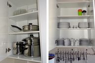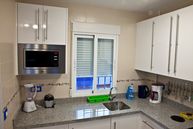 Hay una lavadora en el cuarto de baño con ducha en la planta baja. Hay percheros y pinzas para la ropa, así como una pequeña escalera plegable para que también puedas alcanzar los compartimentos superiores de los armarios.