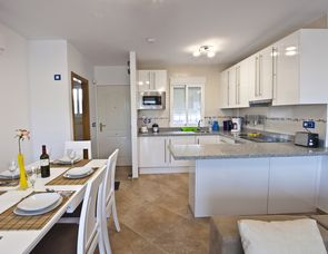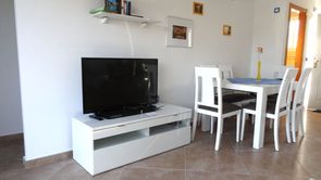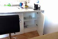 La sala de estar está cómodamente amueblada con un sofá chaise longue, cuyo respaldo es ajustable para sentarse relajado, y dos pequeños taburetes están "ocultos" en el costado. La mesa de café es ajustable en altura para que la bebida y los aperitivos sean fácilmente accesibles. Con TV en español (terrestre), Wifi (cable de fibra óptica) y un reproductor de BluRay, puedes ponerte cómodo en el interior frente a una pantalla plana 4K. La cocina y el salón están equipados con un sistema de aire acondicionado independiente con función de calefacción para el invierno. La puesta en marcha se realiza mediante una función de pago con tarjeta. Puede comprar las tarjetas de nuestro servicio de soporte. Al comienzo de su estadía, el medidor se cobra con € 10.00 como estándar, que le daremos.