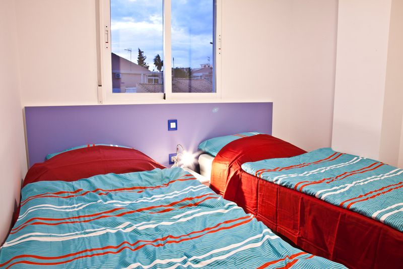 Jedes Haus hat im Obergeschoss drei Schlafzimmer, davon eines mit 150cm/200cm Bett und zwei mit je zwei 90cm/200cm-Betten, die aber zu einem Doppelbett zusammengestellt werden können, sowie ein Bad mit Badewanne, WC und Bidet.